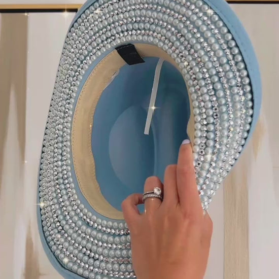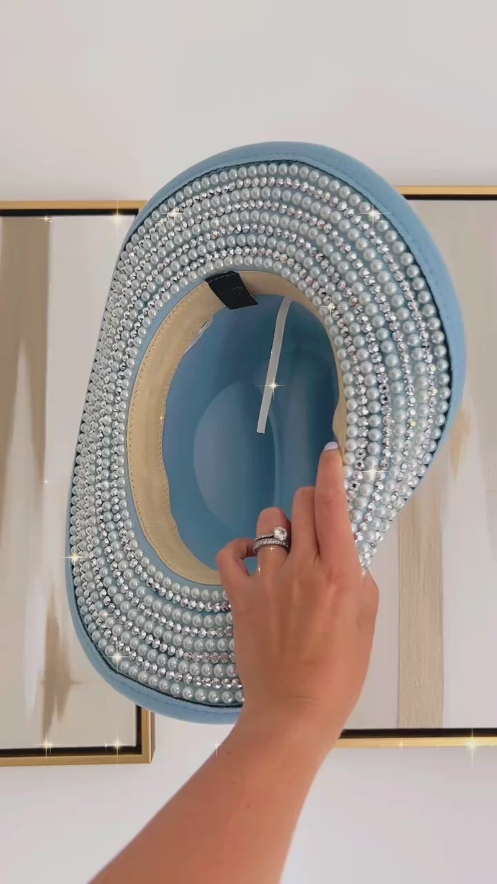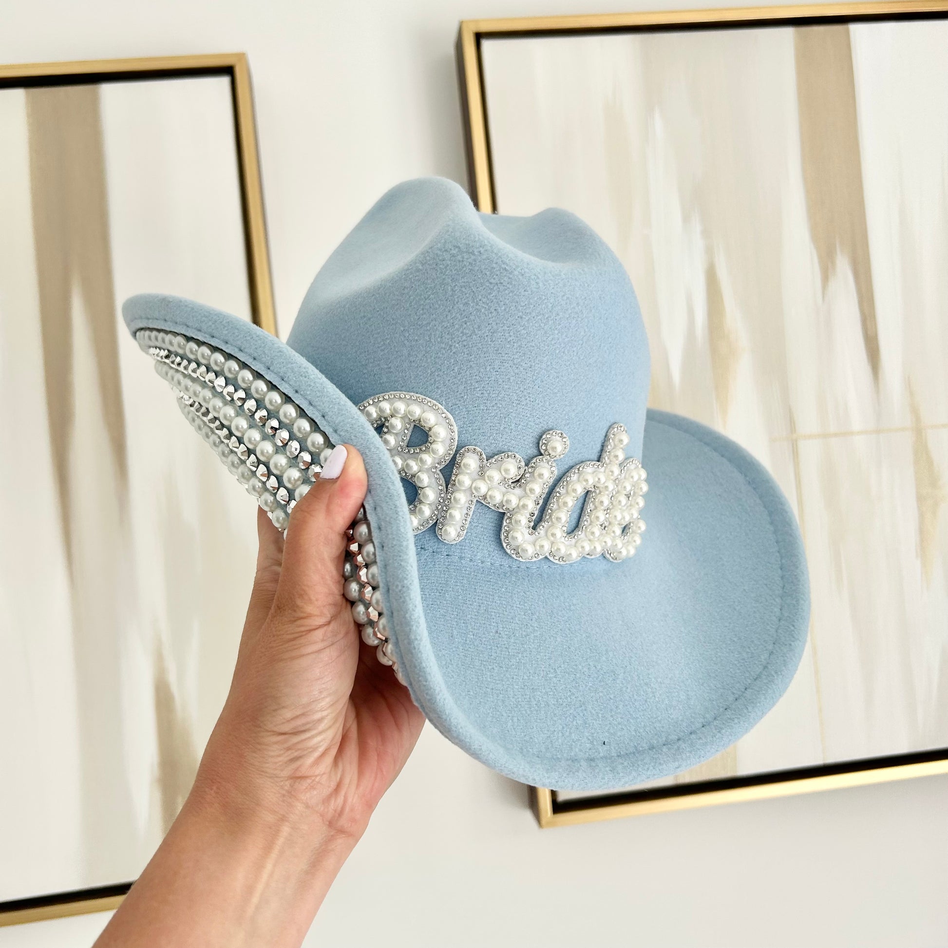 Our pearl bride cowboy hat personalised with either “Bride” or “Mrs”