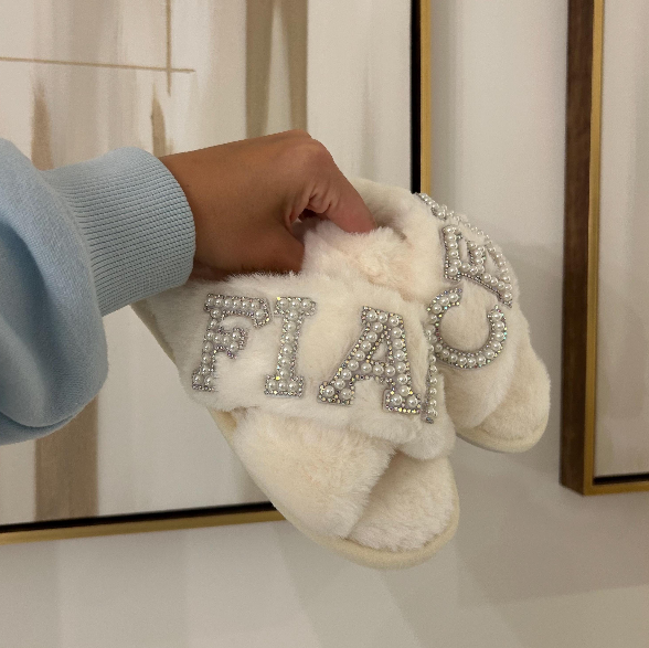 Get ready in style and comfort on the big day with our signature personalised white fluffy Finacee wedding morning slippers (available in other colours/wording please send us a message!)