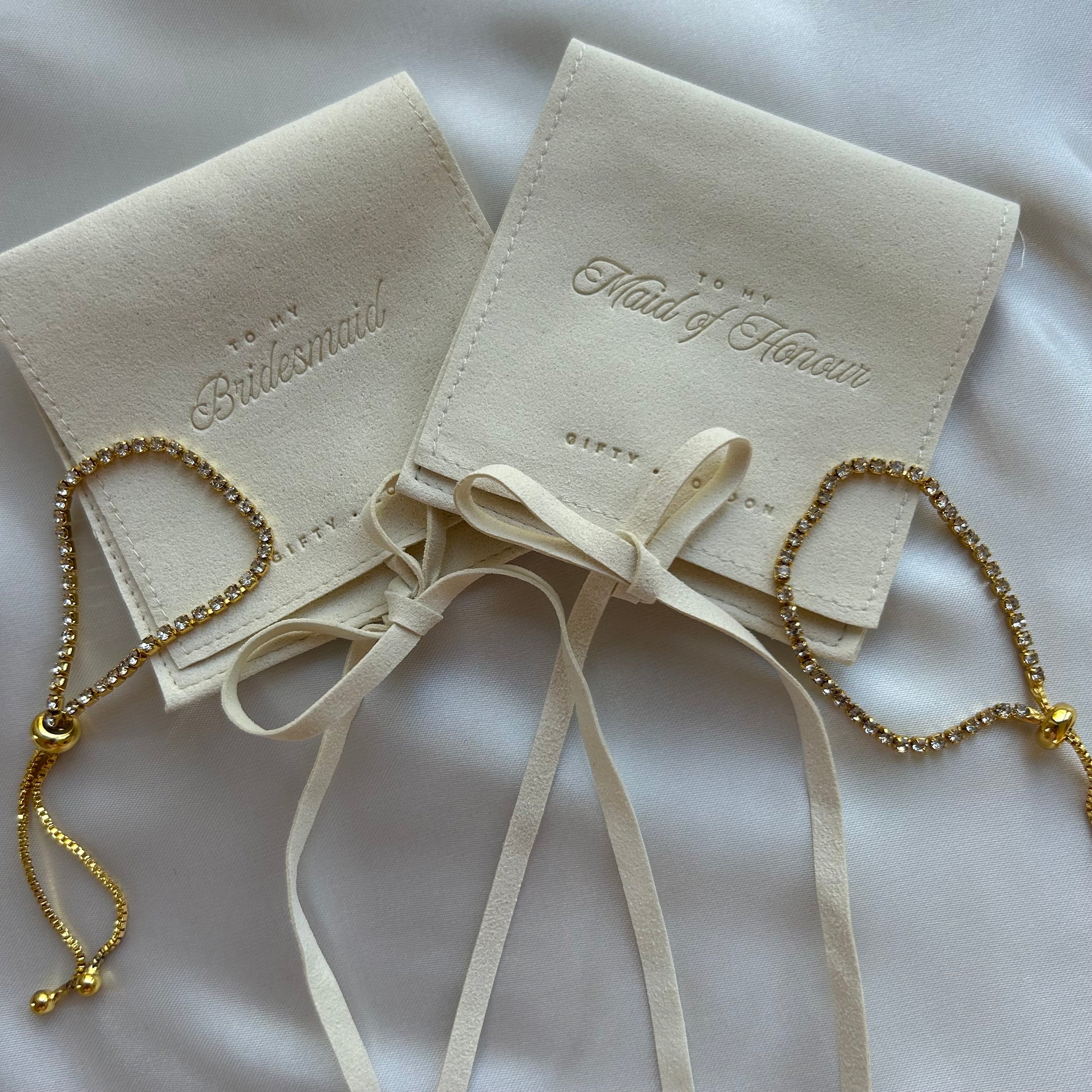 These beautiful dainty personalised bracelets are the perfect bridesmaid gift - with the option to add a bridesmaid pouch. Your bridesmaid will love these in their bridesmaid proposal boxes or on the wedding morning as a lovely wedding day gift.