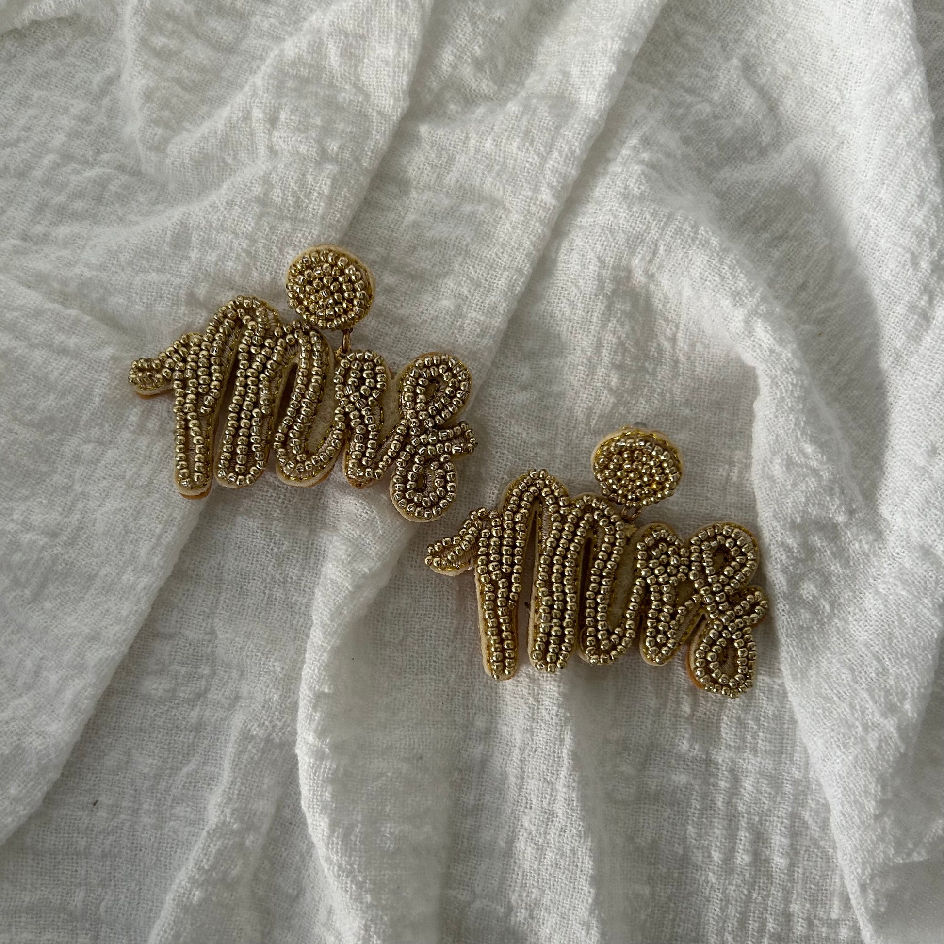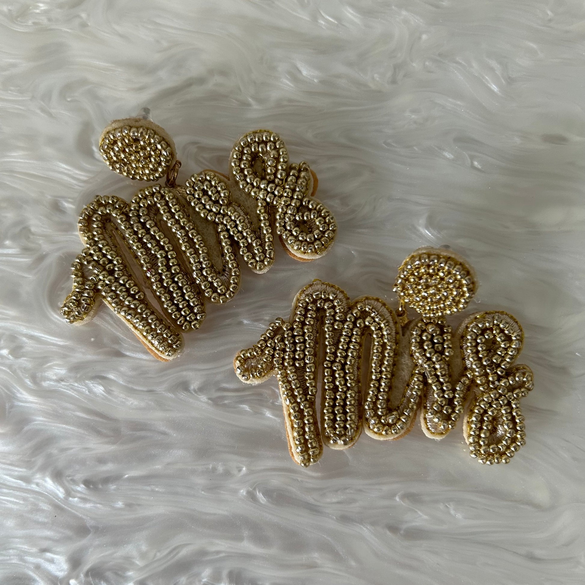 Our stunning gold beaded Mrs earrings - lovely for hen parties and honeymoons alike.