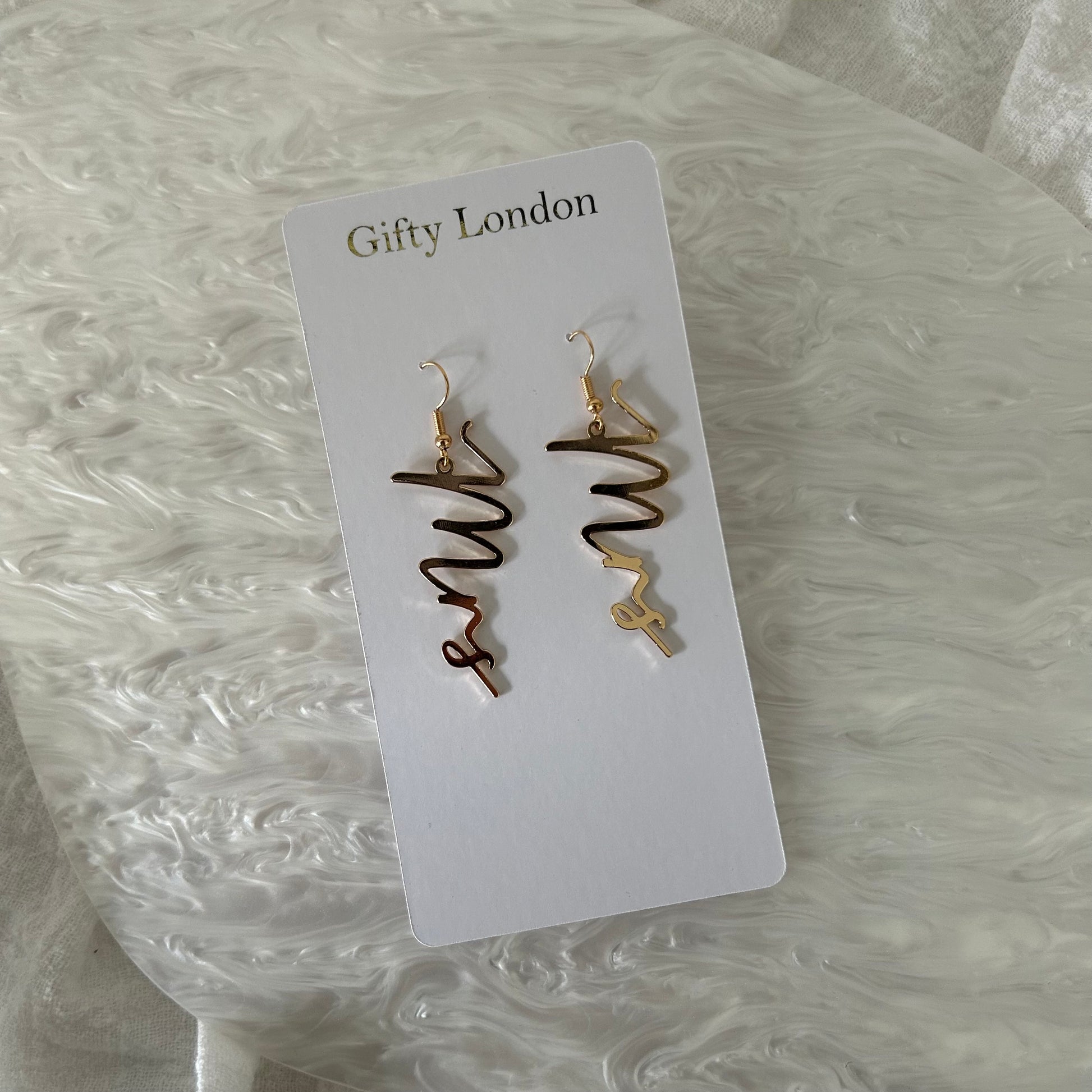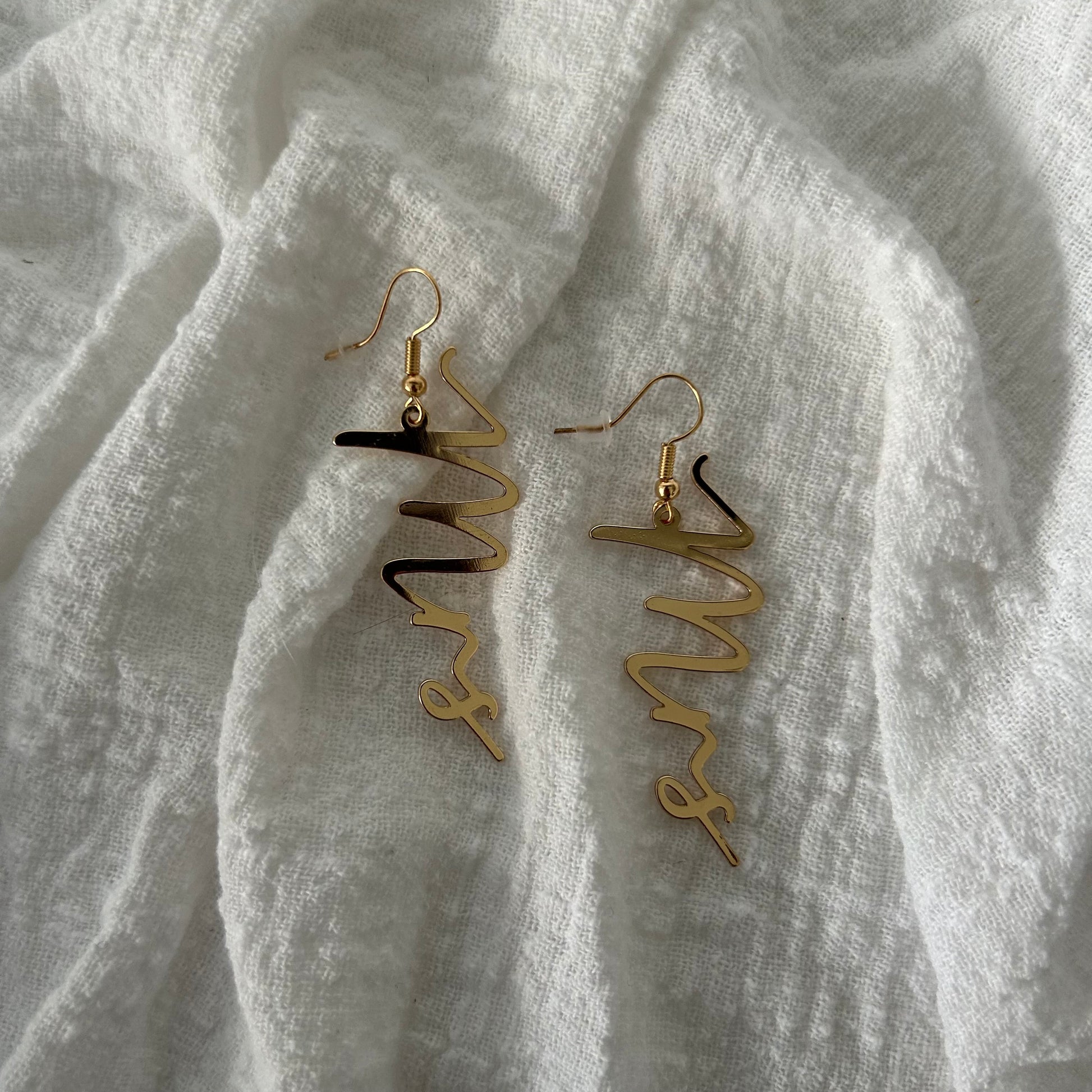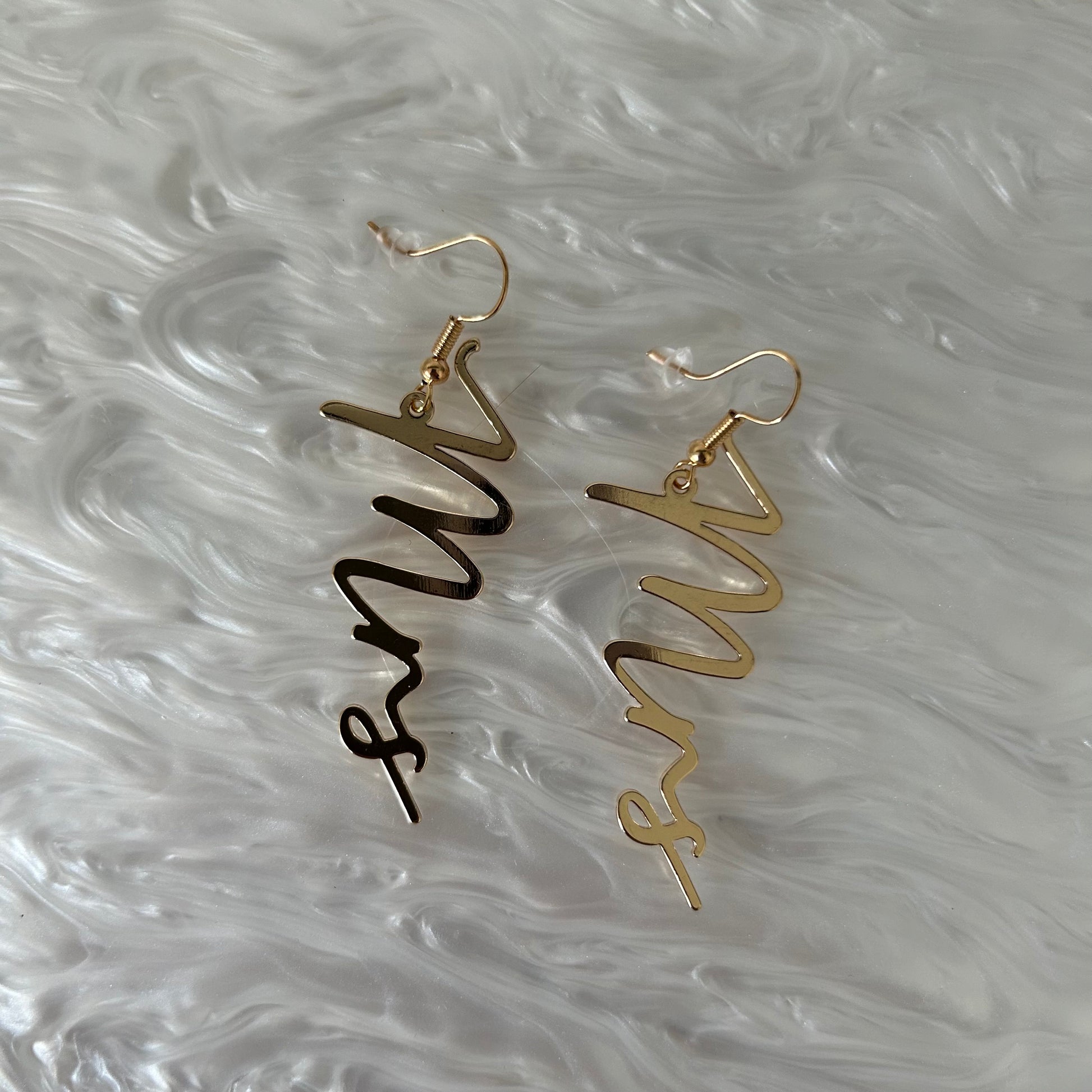 Our stunning gold dangle Mrs earrings - lovely for hen parties and honeymoons alike.