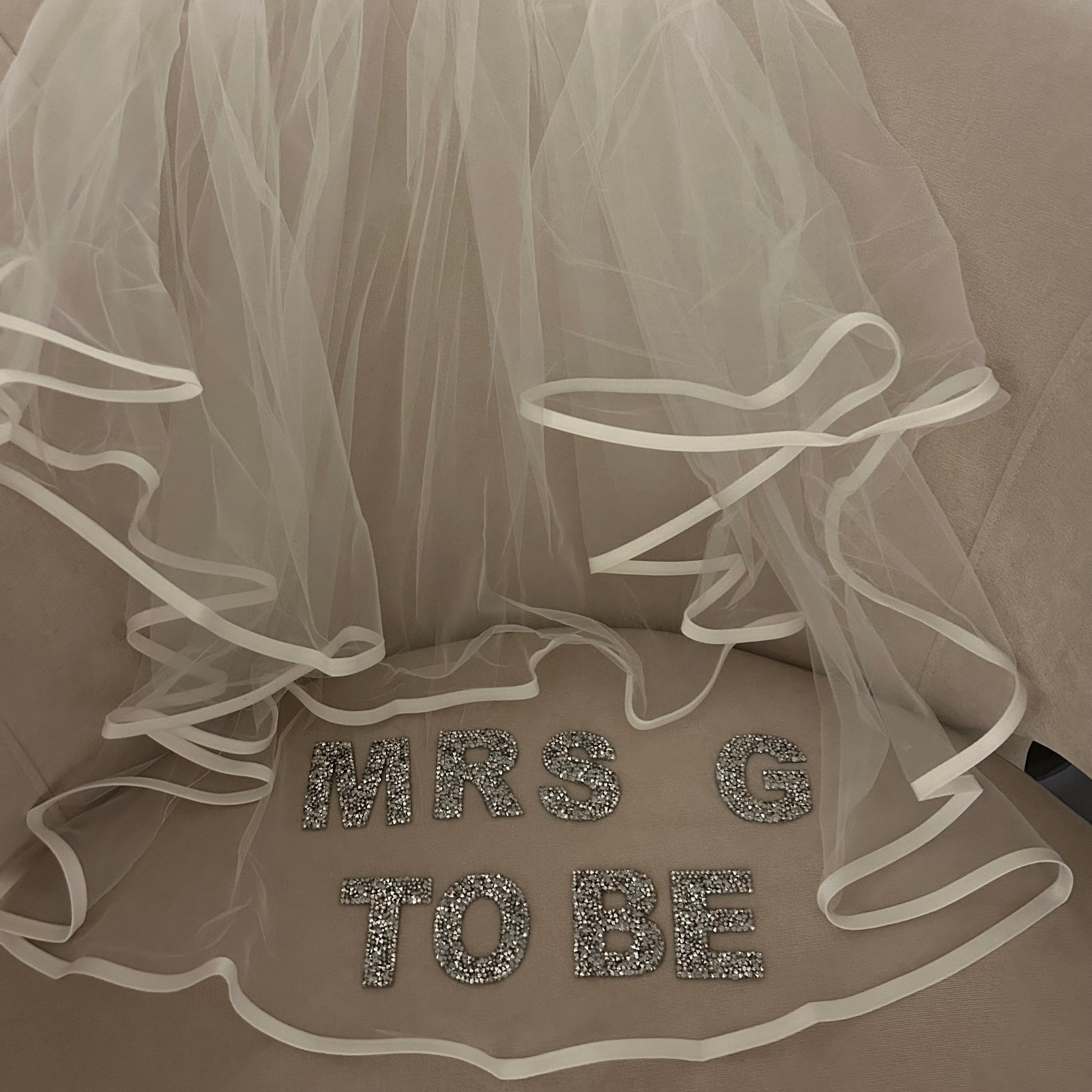 A beautifully designed tulle veil hand embellished with silver sparkle diamanté lettering. Our signature Mrs diamanté personalised veil is the extra luxe hair accessory for hen parties, pre wedding parties or even your wedding day.