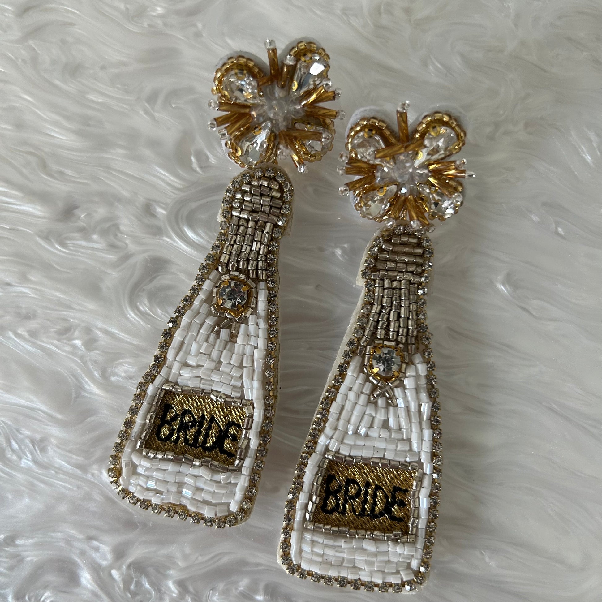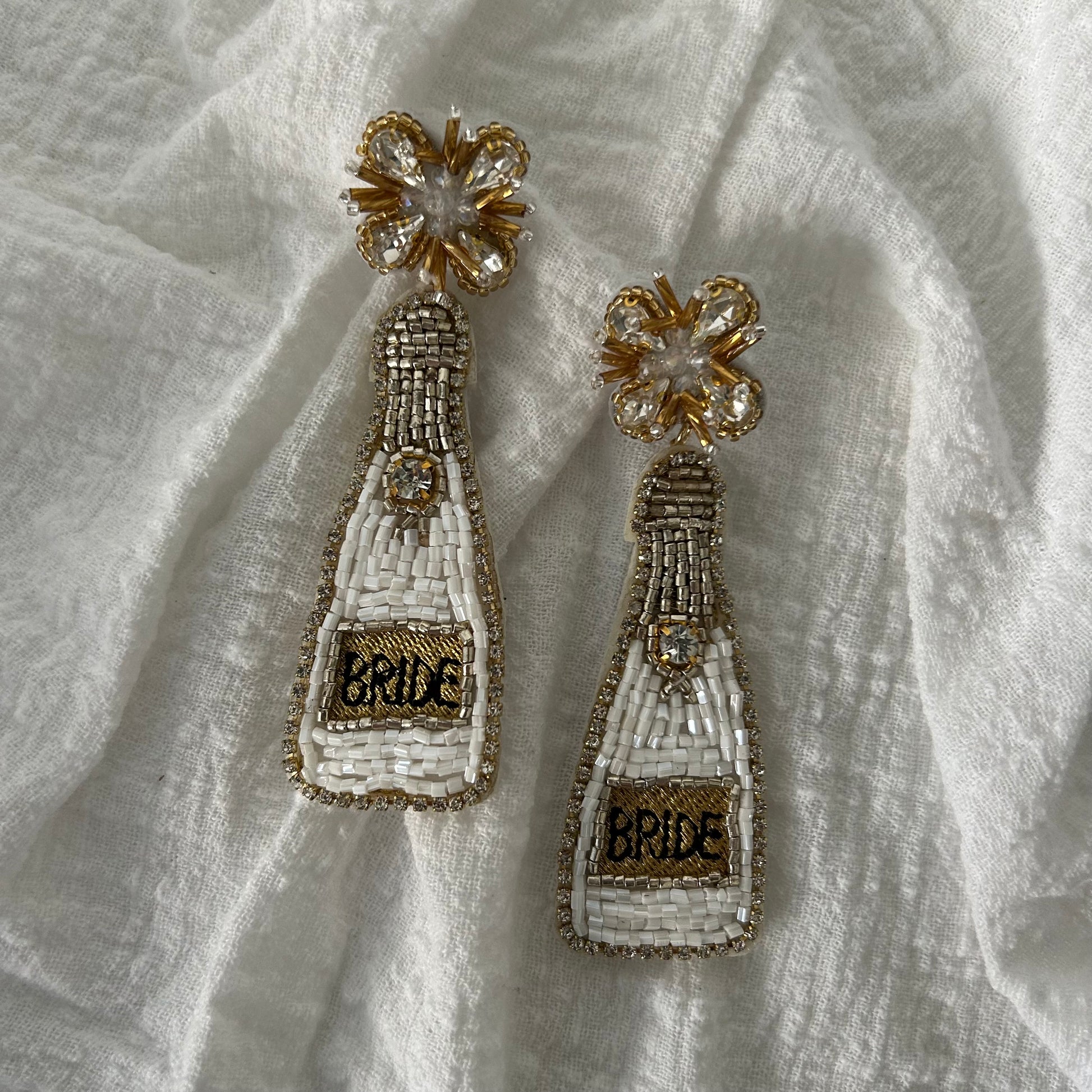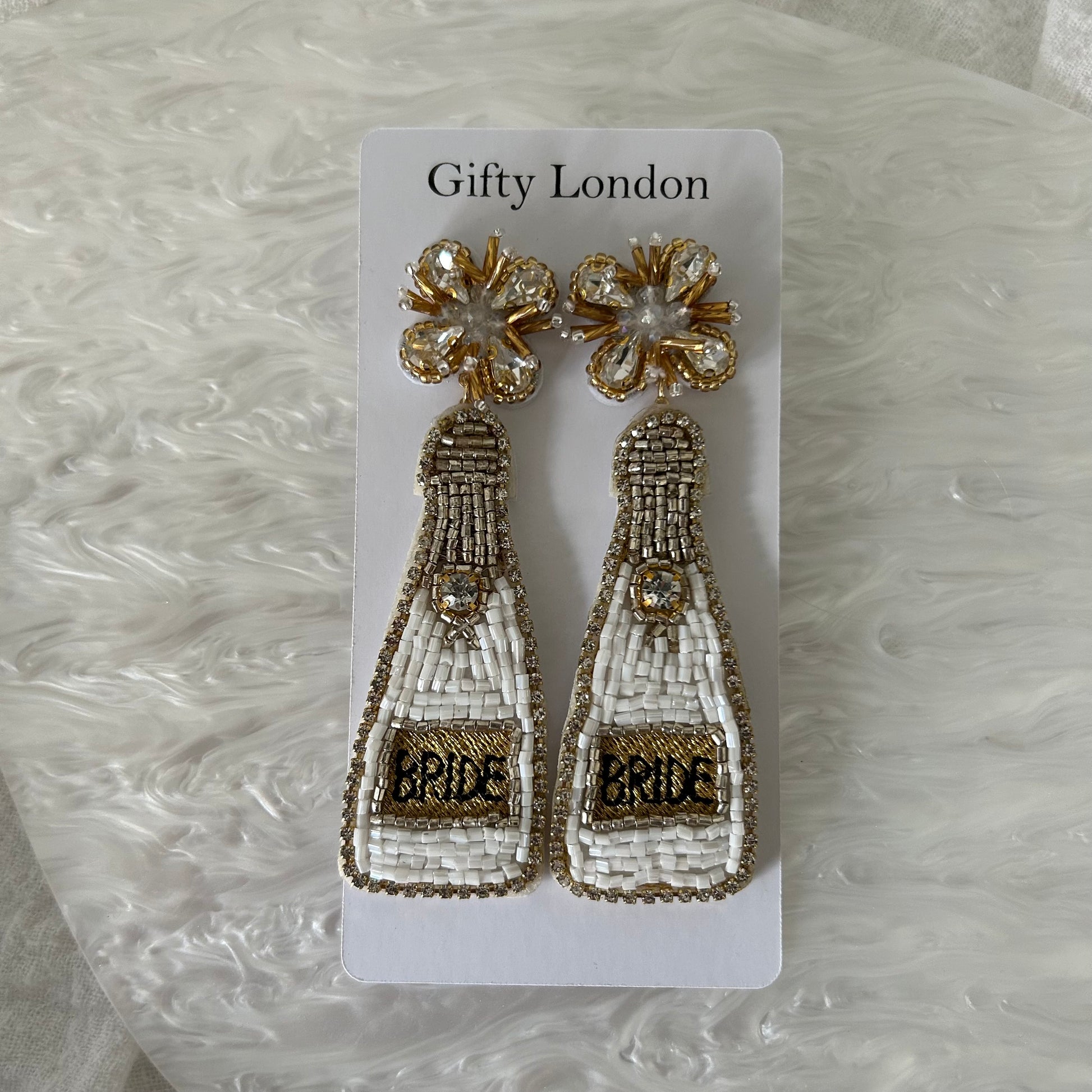 Our stunning white bride champagne bottle dangle Mrs earrings - lovely for hen parties and honeymoons alike.