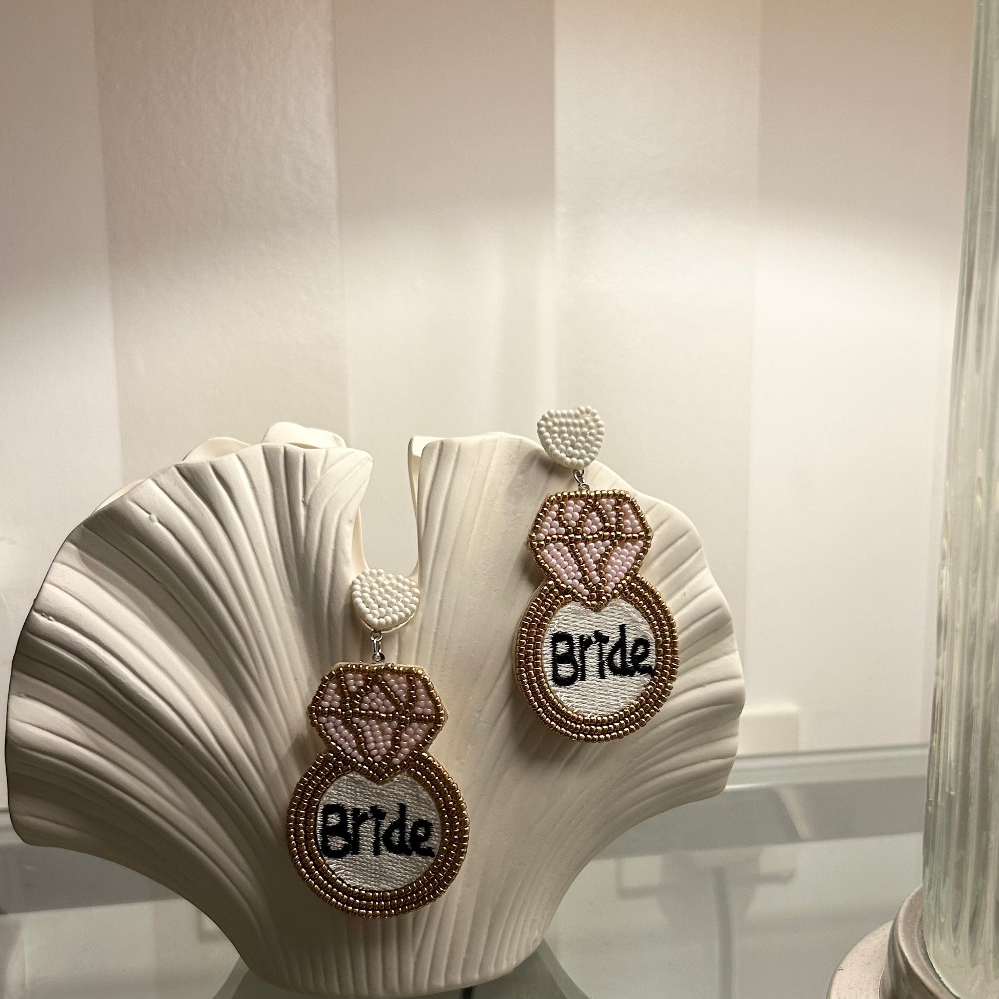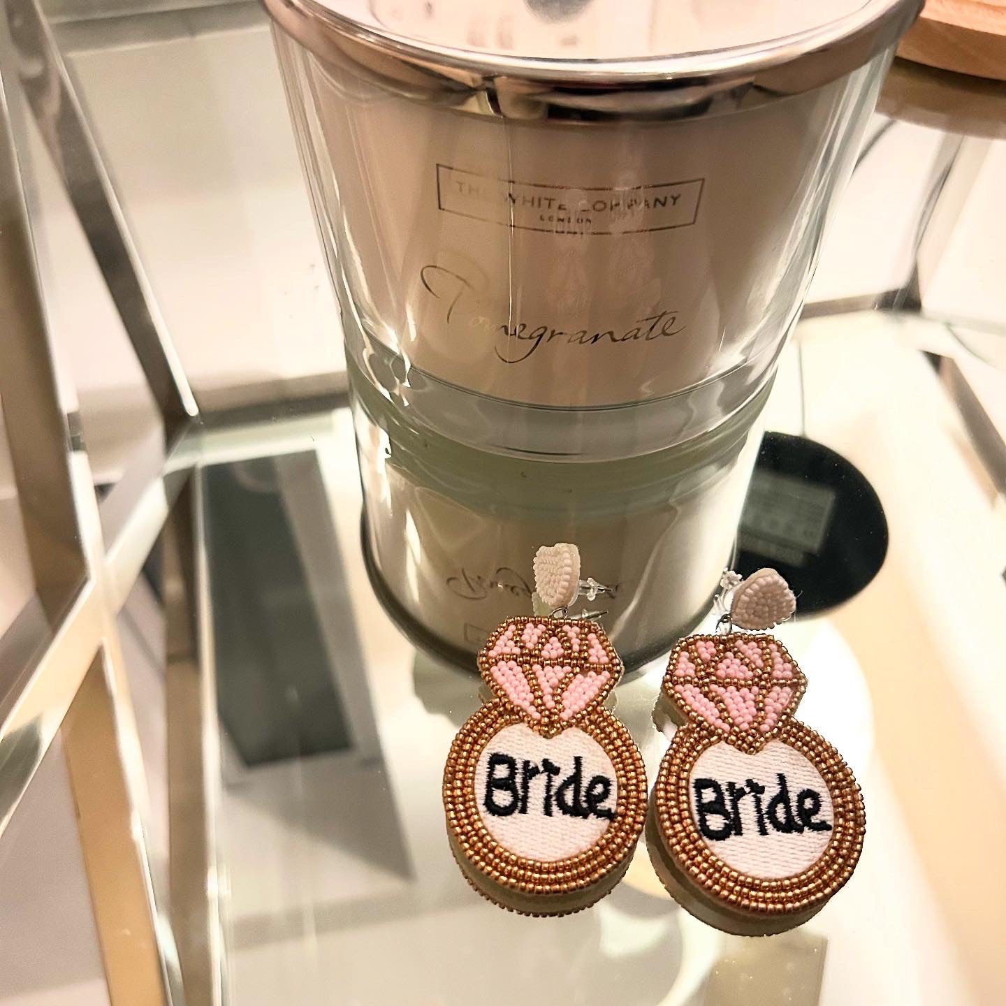 Our stunning white bride champagne bottle dangle Mrs earrings - lovely for hen parties and honeymoons alike.