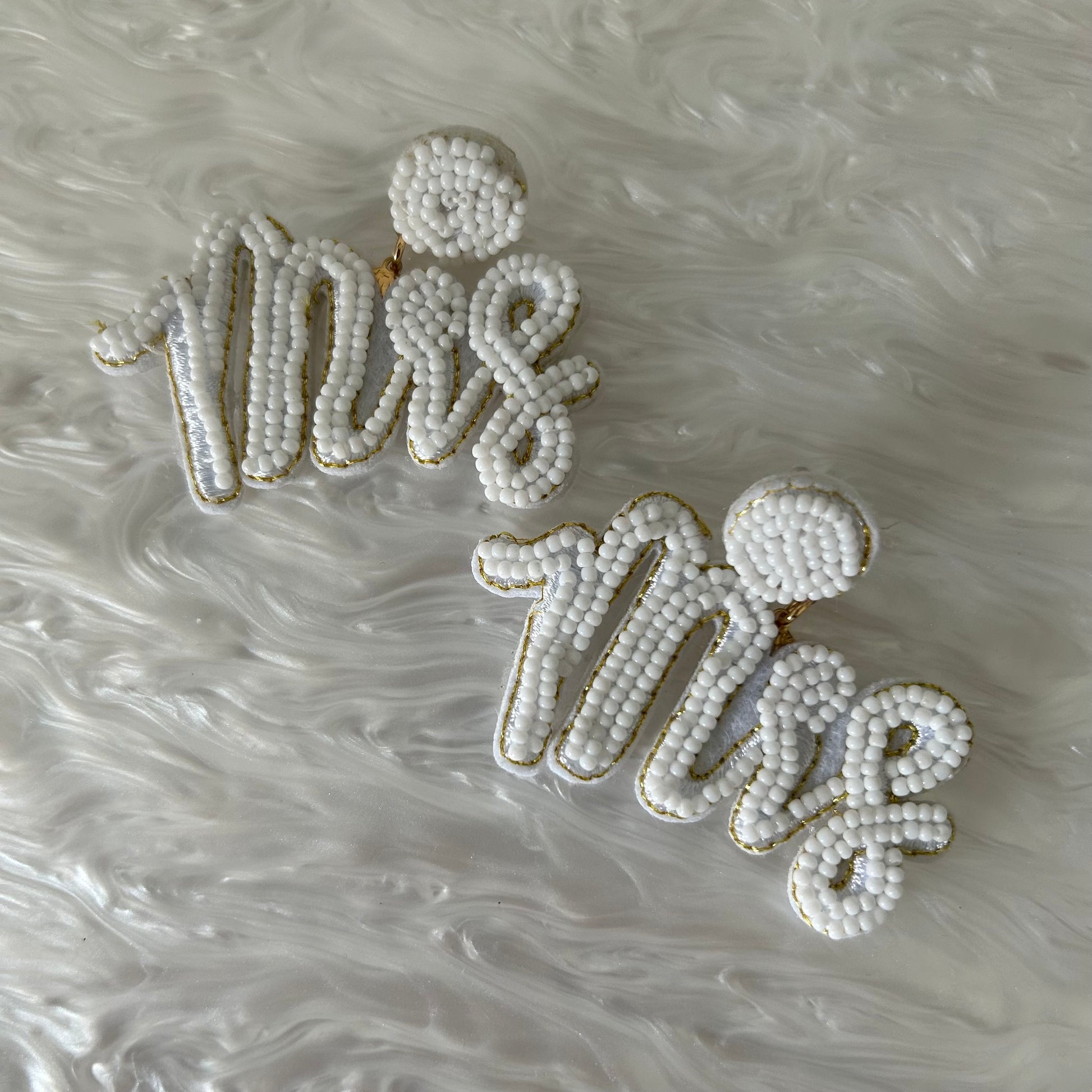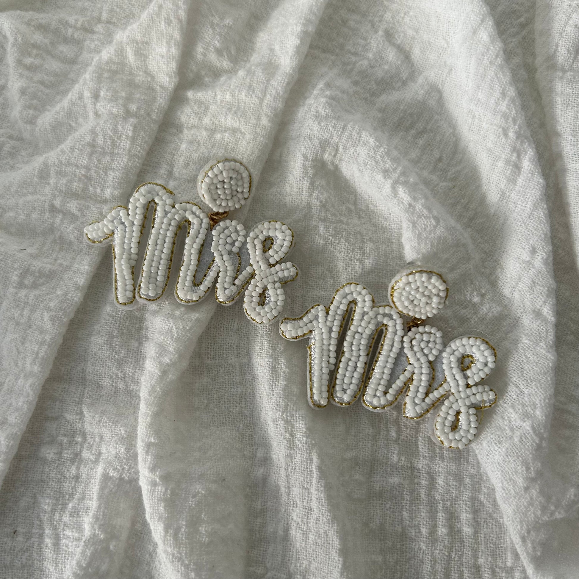 Our stunning white beaded Mrs earrings - lovely for hen parties and honeymoons alike.