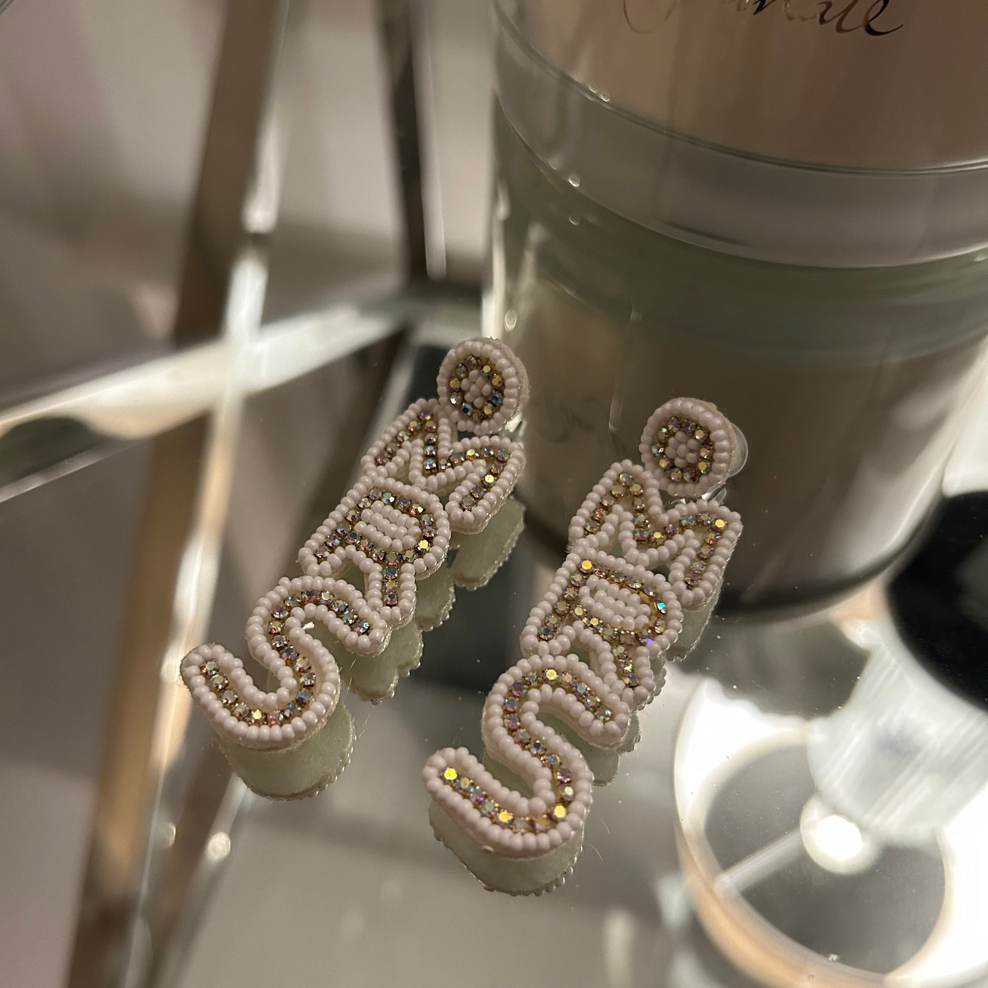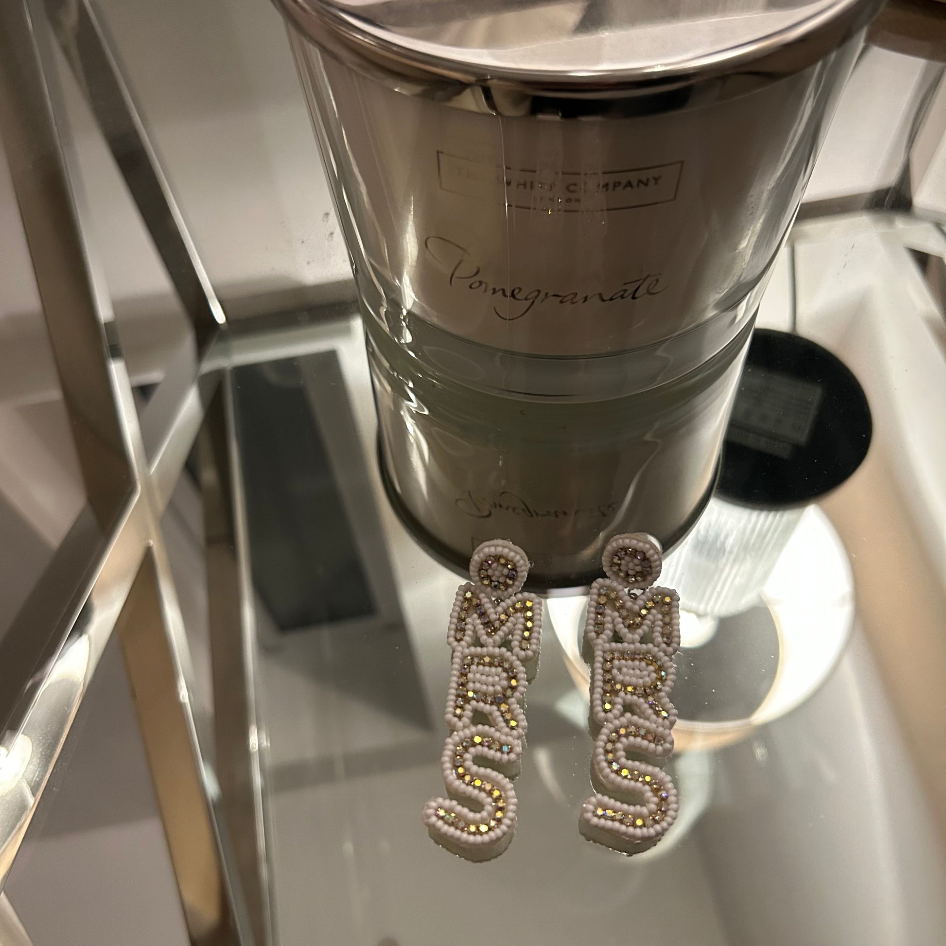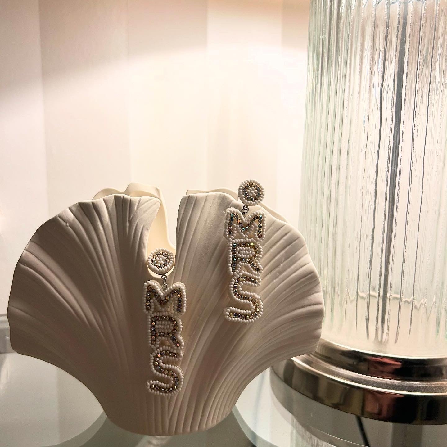 Our stunning white bride champagne bottle dangle Mrs earrings - lovely for hen parties and honeymoons alike.